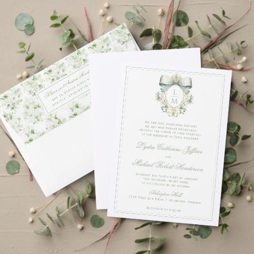 Elegantens Vapensköld med Grönt Bow | Monogram Brö Inbjudningar