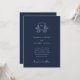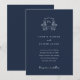 Dessa enkla och elegant, mörk blått bröllopsinbjudningar har en elegant, vit vintage stil vapensköld med initialer eller monogram i mitten. Moderna handskrivna skript och klassisk text på en marin blå bakgrund skapar ett tidlöst utseende.