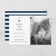 Vattenfärgsankare för nautisk elegant med arrangemang röd anemonblommigt, Photo Bröllop spara datum Card. Baksidan av kortet har marin blå och vit rand mönster. Designad för att matcha vår Elegant Nautical Watercolor Collection.