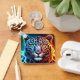 En livfull neonlysande leopardansikte med en delad färgeffekt med lysande turkos och orange ljus. De djärva elektriska linjerna och intensiva ögonen skapar en slående, högkontrastig look som sticker ut mot en mörk bakgrund. Denna färgrika djur-tema design är perfekt för alla som älskar modern, högenergisk bildspråk.