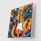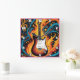 En slående elektrisk gitarr står mitt i snurrande flammor och färglöst mönster och fångar sten och kreativitet i en djärv, konstnärlig visning.