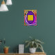 Två symboler för inslag i Ether och Earth plus starkt färgstarkt mönster. Gultens kvadrat och lila ägg.