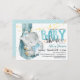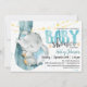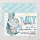 Pojkblått elefant-babyduschinbjudan. Vit, blå och gult inbjudan. Underbar för djungeldjur eller nöjesduschar i safari.