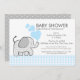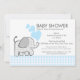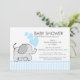 Söt elefantduschinbjudan med grått gingham check mönster och blå hjärtan.