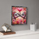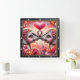 This romantic square wall clock features a beautiful digital illustration of two baby elephants facing each other, their trunks raised to form a heart shape beneath a large, glowing red heart. The elephants have sweet, expressive brown eyes and are adorned with delicate floral crowns made of pink and orange blossoms. The foreground is filled with a lush arrangement of multi-colored roses and swirling golden accents, while the background glows with soft pink light and shimmering stardust. The artwork is encased in a modern black wood-grain frame with bold white numeric markers for easy timekeeping. This functional piece of home decor is a perfect gift for Valentine Day, weddings, or anniversaries, adding a touch of whimsical elegance and warmth to any living space or bedroom.