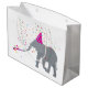 En söt illustration av en elefantpartying och roligt! Elefanten som bär en party-hatt och blåser party-horn med konfetti regnar ner. Låt firande börja! Perfekt för alla som kärlek lustiga djurillustrationer. Perfekt för en födelsedagspresent, daghemsdekoration, barnrumskonst, hemdekaler, Julklapp eller gåva till något annat specialtillfälle.