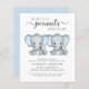 En söt och budgetvänlig twin pojke-enhet genom duschinbjudan med "Två söta små jordnötter är på väg" skriven i mjuk grått modern typografi och ett snyggt-skript, och två pastellblå vattenfärger i baby elefanter. Anpassa med mor till namn och drivenheten genom duschdetaljer i enkel grått-typografi.