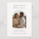 Detta chic och stilrena bröllops kortsvarskort "Save the Date" har ett vackert boho-båge parfoto och ett samtida lavendelfontset, mot en mjuk elfenbensvit bakgrund. Valbara initialer för paret eller ytterligare text kan placeras på baksidan, tillsammans med en mjuk akvarell rosa blomillustration. Denna enkla design genomsyras av modern minimalism med en klassisk romantisk känsla. Variationer av denna design finns tillgängliga i hela kollektionen.