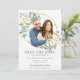Framhäva ditt förbröllopsfoto med detta boho-chica spara datum fotokort. Med vackra akvarell elfenbensvita rosor och eukalyptusgrönska. Designad för att matcha vår Rustic Ivory bröllopssamling. Anpassa det med dina detaljer enkelt och snabbt, tryck bara på knappen för att anpassa och omarrangera stil och placering av texten.