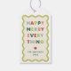 Skapad för att samordna med samlingen "Happy Merry Wavy" av julkort, har denna lekfulla presentetikett för högtider en dekorativ vågig ram. Hälsningen "Happy Merry Everything" är en icke-traditionell hälsning som kan gälla alla högtider som infaller under högtidssäsongen. Orden är gjorda i en mängd olika färger för att ge designen en touch av lekfullhet. Strax under hälsningen finns ett litet hjärta och utrymme för kundens namn. Baksidan av etiketten har ett koordinerande vågigt mönster.