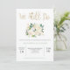 Denna trendiga och eleganta bröllopsjubileumsfest eller vigselförrättningsinbjudan har en bukett av vackra elfenbensfärgade akvarellblommor med gröna blad på en ren vit bakgrund, med falskt guldutseende handskriven skrift som säger "vi gör det fortfarande."