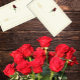 Tidslös elegans: Traditionell minimalistisk röd ros bröllop med manustypografi och elfenbensbakgrund i guld.