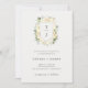 De vackra bröllopsinbjudningarna i snyggten har elfenbensblommor, vita blommor och grönt som omger en vapensköld och initialer.