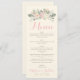 Menykortsdesignen Boho stil bröllop har Menu i skript med anpassningsbarnas ordalydelse och ett monogram som kan vara helt personlig, inramat med romantiska blommor, botaniska löv och dragande fågelfjädrar. Mjuk vintage färg omfattar skuggor av pastellernas rosa, persikor, grädde, grönt, grått och guld. Perfekt för ett vår- eller sommarevenemang. Ljust bakgrundsutskriven bakgrund i elfenben färg kan anpassas.