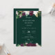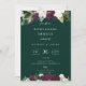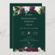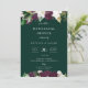 Elegant elfenbensvit och plommonfärgade botaniska blommor, bröllopsinbjudan till repetitionsmiddag. Kortet har en modern vit typografidesignstil mall och smaragdgröna bakgrunder.