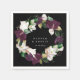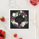 Elegant blomsterkrans, personliga pappersservetter. Kransen har elfenbensvita och plommonlila blommor med rik grönska och gyllna blad.Template tillhandahåller två utrymmen för namn och evenemangsdatum. Bakgrundsfärgen, som visas i svart, kan anpassas.