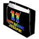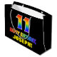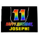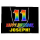 Den här roligten, färglös och glad presentväskan med födelsedagstext har ett stort nummer "11" och meddelandet "GRATTIS PÅ FÖDELSEDAGEN,", båda färgader med en regnbågsspektrumövertoning som inspirerade mönster, tillsammans med en djärv gult redigerbar mottagare namn. Bakgrunden är svart på färgad. En sådan här presentpåse på roligtens födelsedag kan användas för att figurera en gåva eller present som ges till någon som firar sin elfte födelsedag. [~Z0000477]