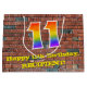 Den här roligten och den klara presentsäcksdesignen för födelsedagspressar, inspirerad av gatukonst och graffiti, har ett stort nummer "11" med en regnbågsspektrumövertoning inspirerad mönster. Det innehåller också budskapet "Lycklig 11:e födelsedag" och ett anpassade namn. Den har också en tegelvägg som inspirerat mönster. En färgfull matsäck i julklapp som den här kan vara ett roligt sätt att figurera en gåva eller present som ges till någon som firar sin elfte födelsedag. [~Z0000522]