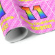 Den här festliga och uppseendeväckande 11:e födelsedagstecknet med papper design har ett stort nummer "11" med ett färgstarkt regnbågsspektrum som inspirerar gradienten mönster. Det innehåller också meddelandet "Lycklig 11:e födelsedag", följt av ett eget namn. Bakgrunden har en rosa i mörk och ett mönster i ljusa rosa rand som innehåller levande hjärtformer i rosa. Papper som detta kan användas när man slår in gåvor som ges till någon i firande på deras elfte födelsedag. [~Z0000415]