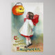 En charmerande vintage Halloween poster med en skräpflicka som tittar upp till en Jack O'Lantern, som målats av den amerikanska illustratören/konstnären Ellen Hattie Clapsaddle. com