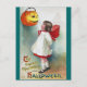 En charmerande vintage Halloween-kort med en skräpflicka som tittar upp till en Jack O'Lantern, som målats av den amerikanska illustratören/handelskonsten Ellen Hattie Clapsaddle.