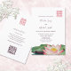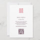 Den här blommigtens bröllopsinbjudan innehåller en vattenfärgsmålning av en lotus blomma och en lyckosymbol för dubbla i en matchande rosa på en vit bakgrund. På baksidan finns en skannerbar fyrkantig kod för webbplatsen bröllop.