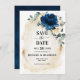Blått blommigt-kort för mörk med elegant av marinblått, royal blått, vitt, guld, champagne elfenben, färg bröllop spara datum, vattenstånd, blomknoppar av ranunkulus och sage ro eucalyptus grönt och löv vattenfärg med runda elegant-glitter. Kontakta mig om du behöver hjälp med anpassning eller om du behöver någon annan produkt med den här designen.