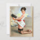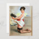 Elvgren Pin Up Girl Art. En kvinna som är klädd i en vit apron och röda klackar nickar i ett kök och håller en bricka med bränd mat med stigning rök. Hennes uttryck antyder förvåning när hon tittar över axeln.