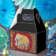 Bild av en indisk elefant som dekorerats med sekviner och pärlor i vitt, silver och guld mot maronrött sammet.