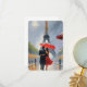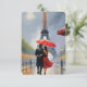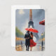 Gå in på de vackra gatorna i Paris med denna fantastiska målning som fångar kärnan av kärlek mitt i stadens tidlösa charm. Ett par, elegant klädda, delar ett ömtåligt ögonblick under ett sjudande rödparaply och skapar en slående kontrast mot de regndränkta stenarna. Eiffel Torn, som är en evig symbol för romantik, stiger i stor utsträckning i misterminen, dess silhuett ett löfte om drömmar och äventyr. Ge är en stor Tack med det här snyggt designkortet.