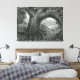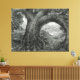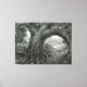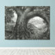 A detailed charcoal drawing by Amanda Diehl features a large, old tree growing bent over the edge of a cliff in the foreground. The tree's trunk and roots are prominently displayed, with intricate textures and patterns. Through a natural arch formed by the tree's branches, a landscape with hills, vegetation, and a cloudy sky is visible. Several birds are flying in the distance.