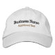 Ditt företag namn och ytterligare text som slogan, namn, arbetsnamn osv., på en helt anpassade med broderade basebollhatt/basebollhatt. Visad är en vit hatt som broderats med mörk blått och guld. Alla delar av hatten och texten är redigerbara, inklusive hatt och text stil, färg, formuleringar, textplacering osv., och kan användas för alla anställda, presentationsmöjligheter, affärsprogram eller evenemang. Designad vid samtal. #PromoteBusiness #EmployeeHat #EmployeeUniform #CustomBusiness