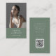 Den här sage grönt boho rustik, enkelt, modernt affärskort från Emelia Collection är en perfekt för en småföretagare, konsult, stilist och mycket mer! Grönten av mörkens sädesslag har en rustik och enkel typografi med ett skogsbergsmärke. Anpassa affärskortet med ditt foto och en QR-kod.
