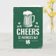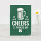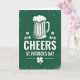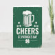 This card shows a frothy beer mug in textured off-white centered on a deep emerald green background, setting a cozy pub scene that feels like friends leaning in for a toast 💚. The foam is dotted with tiny speckles, giving it a soft, airy look that draws your eye closer. Below the mug, “CHEERS” sits in large capital letters, with “ST. PATRICK’S DAY” placed underneath in smaller type, both in a matching creamy off-white for strong contrast. Shamrocks and small bow ties frame the design on both sides, like little decorations arranged with care for someone you’re glad to celebrate with ☘️. A distressed, vintage-style finish runs across the whole card, with faint flecks scattered over the green and edges that look gently worn. The balanced layout keeps everything centered and easy to read, like a well-set table ready for clinking glasses and easy conversation. Tiny white specks drift across the green field, and the corners fade slightly as if the print has been handled and kept over many seasons.