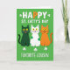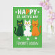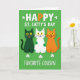 This card shows three stylized cats sitting in a neat row on a bright emerald-green background, their wide yellow eyes and small smiles giving them an easy, friendly charm 💚. One cat is deep green, the middle cat is white with emerald spots, and the third is orange, and their close spacing makes them feel like a little trio that belongs together. Their relaxed poses and matching grins suggest a shared joke, like close friends leaning into a holiday moment. Across the top, the phrase “HAPPY ST. CATTY’S DAY” is set in large all-caps text, with most of the letters in white and the “PY” in orange to echo the orange cat and add contrast. Small white shamrocks are scattered around the cats like confetti, reinforcing the St. Patrick’s Day theme ☘️. Near the bottom, “FAVORITE COUSIN” appears in white all-caps, centered and spaced neatly under the characters. A soft shadow sits just beneath the lettering, and the shamrocks and cats stand out crisply against the solid green field.