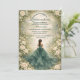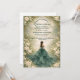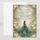 This elegant quinceañera design features a soft emerald green watercolor background framed by romantic ivory roses, delicate greenery, and subtle gold accents, with a graceful gown illustration creating a refined, enchanted garden atmosphere. The rich green palette combined with classic florals gives the design a luxurious yet youthful feel, perfect for a timeless quinceañera celebration with a romantic, nature-inspired aesthetic.