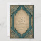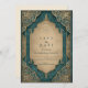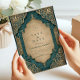 An exquisite Islamic wedding design inspired by the beauty of mosque architecture and traditional arabesque patterns. The emerald-green background and ornate gold detailing evoke luxury and devotion, making it perfect for couples celebrating their union with elegance and spiritual grace.