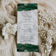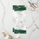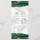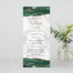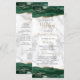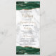 This elegant, modern wedding program features emerald green watercolor agate top and bottom borders trimmed with gold faux glitter. The text appears in elegant gold-colored handwriting and black copperplate font on a gray and white marble background.