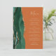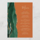 Den vänstra kanten av denna eleganta moderna bröllopsmeny har en framväxande grön vattenfärgskantad kantlinje som trimmas med faux gold glitter. Den anpassningsbara texten kombinerar guldfärgade, vita handskriftsskript och färgade teckensnitt på en bränd orange bakgrund. Den omvända sidan har en matchande framväxande grönt och guld agate-design.