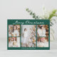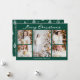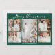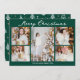 Trendy emerald green holiday cards with chic handwritten scrawl MERRY CHRISTMAS above your family photo collage of your 5 favorite 2025 pictures. The beautiful back features a pattern of white hand drawn pine and fire trees. Modern elegant Christmas cards featuring one vertical photograph in the center and 4 square pictures on the sides.