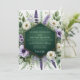 This design features a lush display of white roses, purple lavender, and violet anemones set against vibrant emerald green foliage. The organic arrangement creates a serene and elegant atmosphere, perfect for a nature-inspired spring nuptial. A deep forest green backdrop provides a sophisticated contrast to the delicate watercolor floral elements.