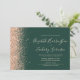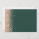 The left-hand edge of this elegant modern wedding invitation features a peach faux glitter border. The customizable text combines peach handwriting, copperplate and italic fonts on an emerald green background. The reverse side features a matching green and peach glitter design.