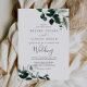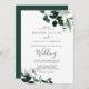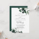 Det här larmkortet är perfekt för en boho bröllop. Den eleganterna, men ändå strålande utformningen har moody mörk grönt löv för vattenfärg och eukalyptus med en modern bohemisk skogskänsla.