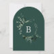 Den här framväxande gröna eleganten, den moderna boho arch bröllopsinbjudan är perfekt för en boho bröllop. Den eleganterna, men ändå strålande utformningen har moody mörk grönt löv i vattenfärg och eukalyptus med en modern bohemisk skogskänsla.