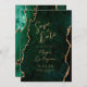 Med det här elegant bröllop kan du spara datumkortet med en bakgrundsbild av en vattenfärgad agate i grönten emerald som trimmas med faux guld glitter. Anpassadet kombinerar modern handskrift, tryckplåt och kursivt typsnitt med guld-färgad. Den omvända sidan har en samordnande grönt och guld agate-design.