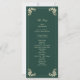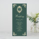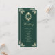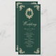 Elegant bröllop-programkort i emerald grönt med ornat baroque guld blommor och ett lyxfritt Victorianmonogram. Det här dubbla-sidiga programmet ger utrymme för ceremonin, musikaliska val, avläsningar och bröllopsfesten. En tidlös design som perfekt matchar en framväxande grönt- och guld bröllopssvit, perfekt för par som planerar ett sofistikerat och formellt firande.