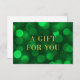 Presentkort med ord "A Gift for You" i faux guld mot en framväxande grönt bokeh ljus mönster på framsidan. Anpassa det här kortet med dina uppgifter genom att ersätta platshållartexten. Om du vill ha fler alternativ, t.ex. att ändra teckensnitt, storlek text / färg eller mellanrummet mellan brev, klickar du på knappen "Anpassa". *Observera att Zazzle Watermark som visas i zoomförhandsvisningen INTE visas på den färdiga tryckta produkten. © Rosewood and Citrus