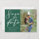 Detta solida smaragdkort för grönt bröllop spara datum innehåller klassiskt vitt skript för ett par som gifta sig i en skog eller på en annan naturplats. Anpassa med ditt favoritfoto med ett par förlovningar. Fira kärlek med det här stilla färg och samordna med vår minimalistiska typografisamling.