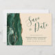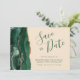 Den här eleganten är modern när du sparar datumkortet och har en vattenfärgsagate i grönt som går ut på att gräns trimmas med faux guld glitter. Anpassadet kombinerar handskriftsskript, tryckplåt och kursivt typsnitt i grönten emerald på en champagnebeige bakgrund. Den omvända sidan har en matchande framväxande grönt och guld agate-design.
