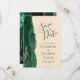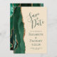 Det moderna bröllop spara datum-kortet från elegantens lämnat kant har en framväxande grönt vattenfärgsagat gräns som trimmas med faux guld glitter. I anpassadet kombineras handskrift, tryckplåt och kursivt typsnitt på grönt med bakgrunden till champagnebeige. Den omvända sidan har en matchande framväxande grönt och guld agate-design.